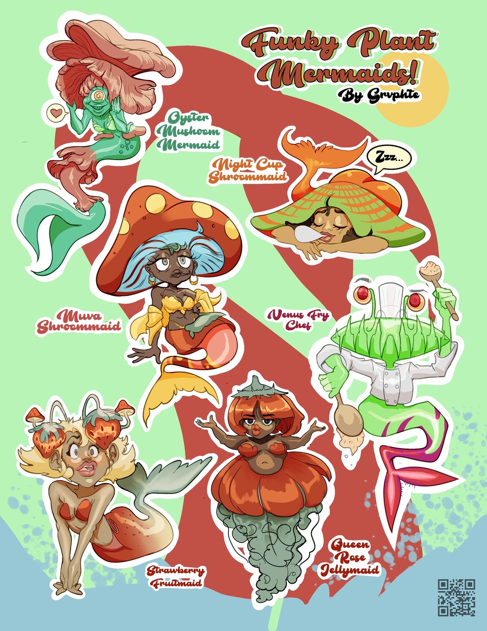 For Mermay 2023, there a prompt called "Mushrooms" so I made a few plant and Shroommaids! This preorder will get you a vinyl sticker sheet the size of a sheet of paper (8.5 x 11). Shipping may take a few weeks as orders are being made!